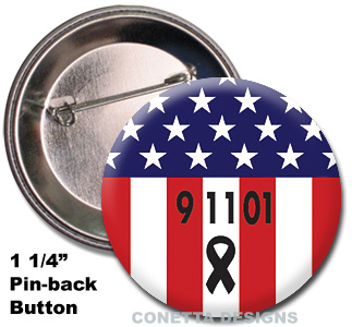 Remember Always & Forever! Mini Patriotic 9-11 Awareness Pin-back Buttons, fully assembled. Perfect for commemorating 9-11 and the USA. Minimum order 10 buttons. Made in USA